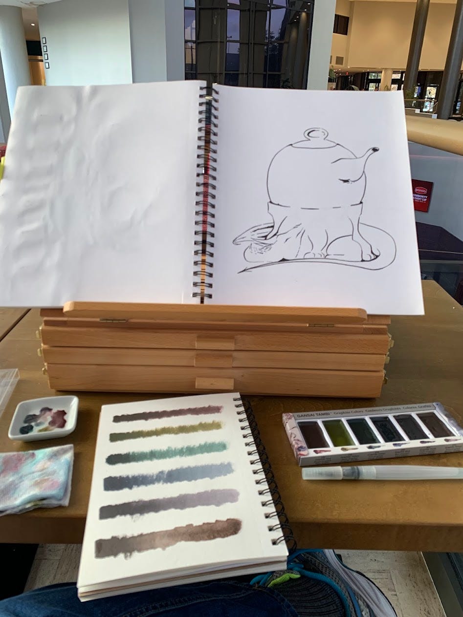 I also made time in the early morning, since I’m the rare early bird at a convention, to find a quiet place and paint a little. I didn’t finish anything, but the moments of peace were a wonderful way to start my days, and the hotel was a good place for it, having great lighting through a stories-high glass roof, and many seating nooks I could curl up in.