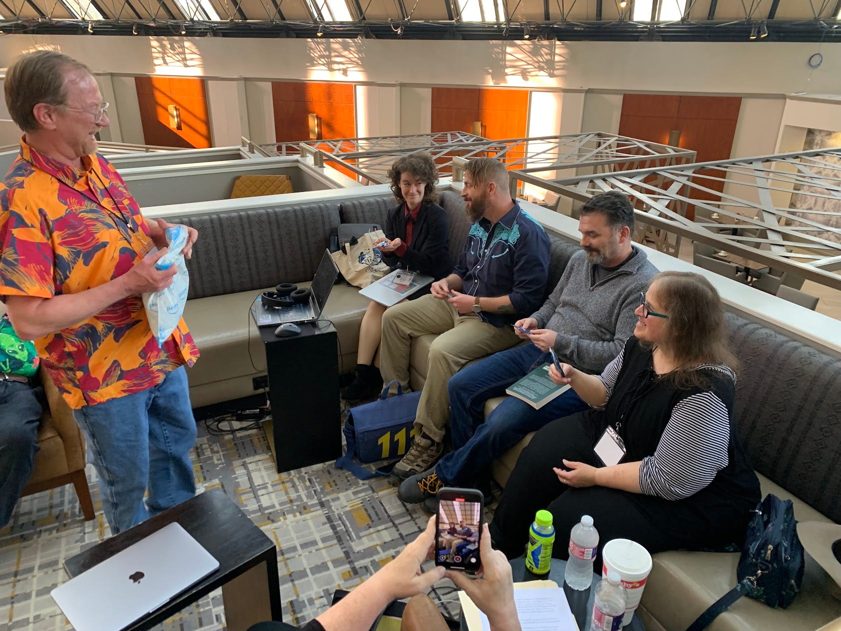 In a fun and touching ceremony, they elevated my young man to Minion, First Class! and recognized his help over the years when he’d decided to step in and help out for no other reason at first than they would let him. He’d tagged along to his first FenCon because I was going, and he expected to be bored out of his mind. He’d manned my sales table that first year, and somehow he’d connected with his fellow geeks being the tech guys who make a convention hum along on the surface, while they are the myriad paddling duck legs below the surface making it all look good to the congoers.