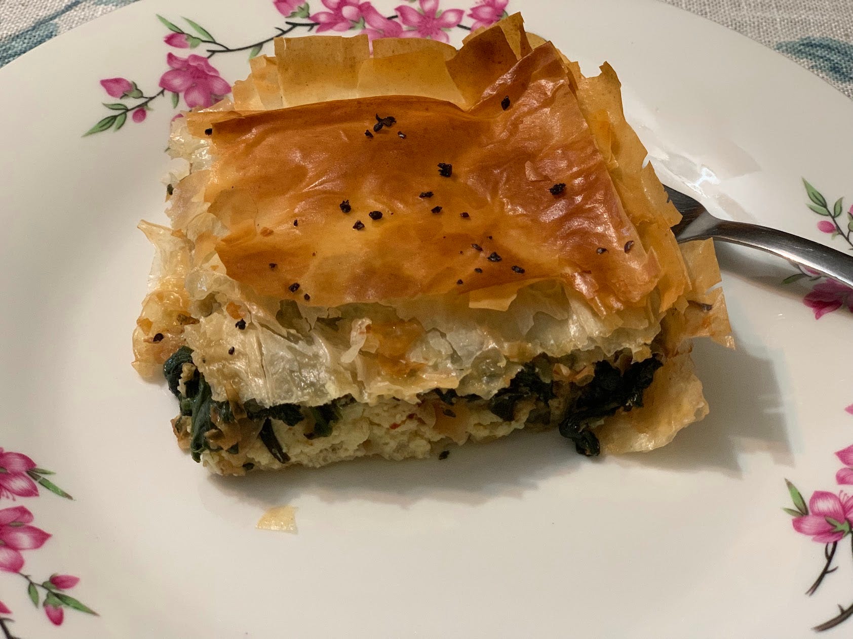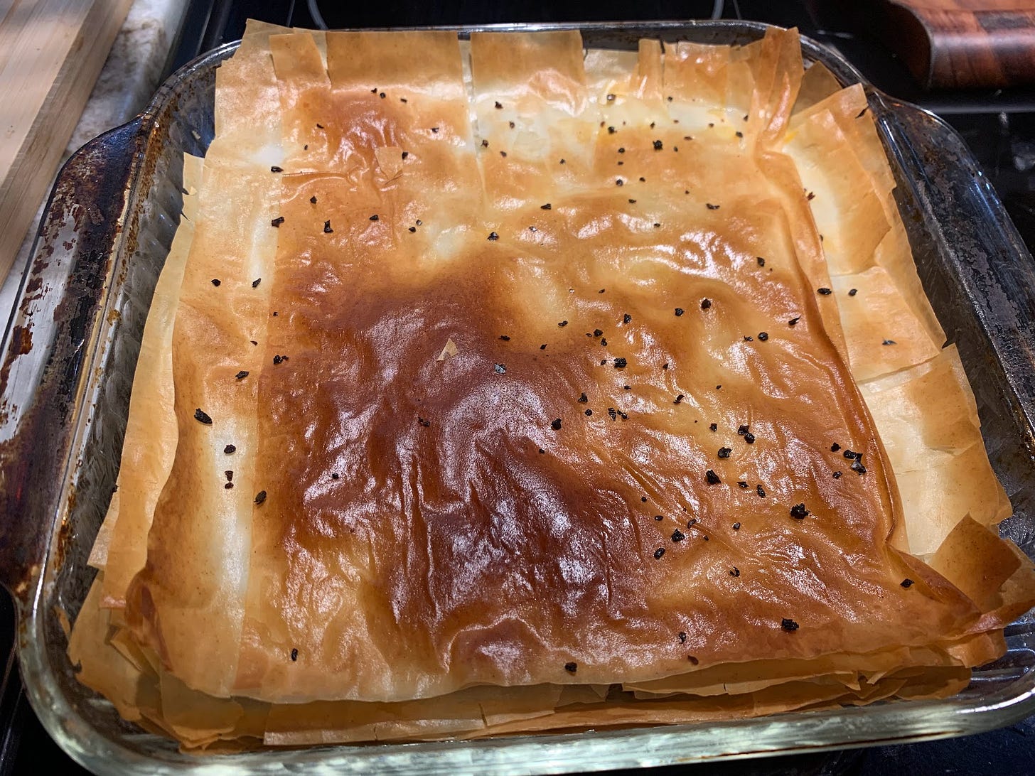 On top of the filling, later another 6-8 sheets of filo, brushing each layer with olive oil. I sprinkled a little Aleppo Pepper on top before sliding it into the oven. Bake at 375F for 20-25 minutes, until the top is crisp and brown, and if you can see the filing, it’s bubbling.
