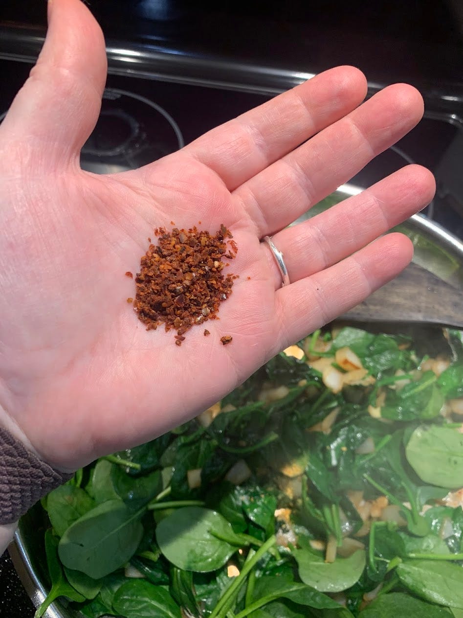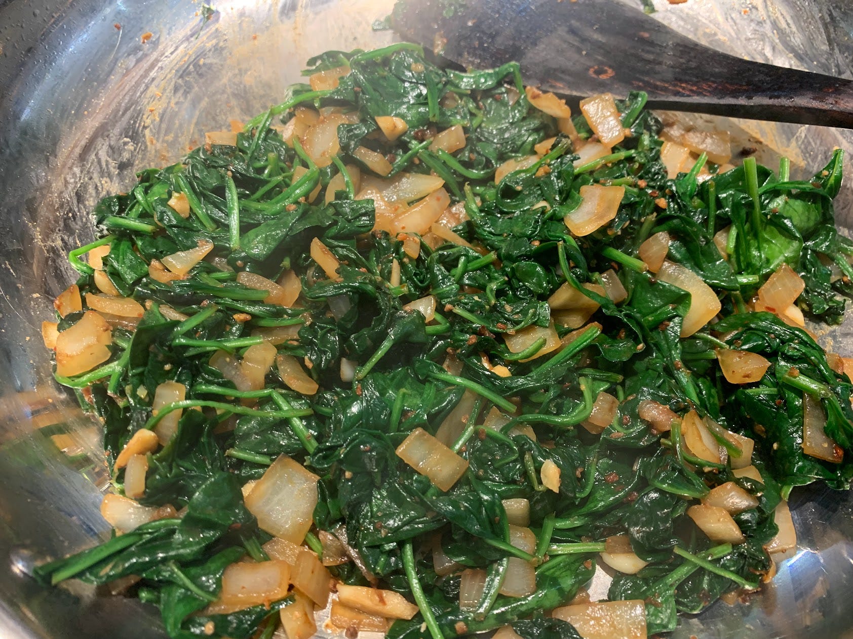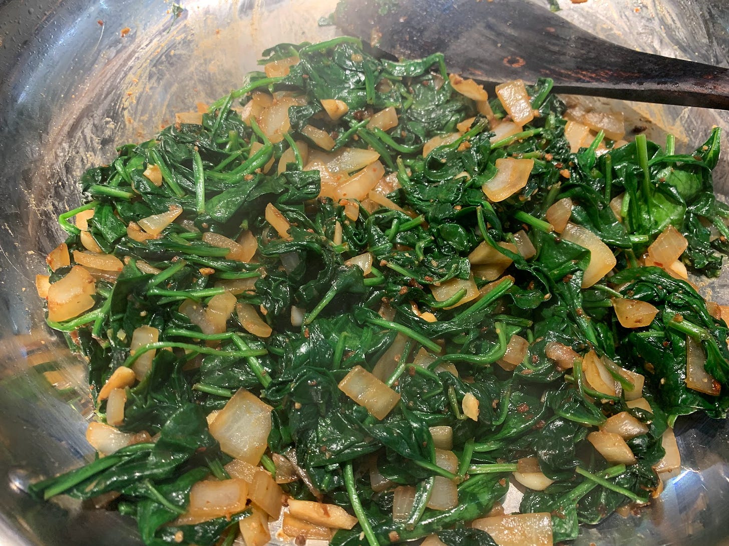 *This would be very doable with frozen spinach. Simply thaw it, squeeze as much liquid out as possible, and add it to the onions, cooking only long enough to ensure there isn’t any runny liquid left in it.