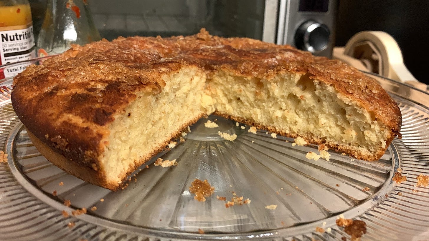 I’d asked on social media what people thought “1 cent yeast” meant, and had a lot of interesting answers. However, I hadn’t waited for them, I looked at the amount of dough this would make, and used 2 tsp yeast which worked well. This does make two cakes in 9” round cake pans. I baked it at 350F for about 25 minutes. The resulting dough is very soft, like a batter, but yeast risen. The flavor is lovely, but best when very fresh and warm. We took one cake to share with friends, and the other was breakfast for a couple of mornings.