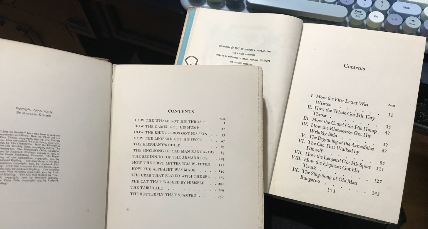 Out of most ‘scruciating curiosity (as I rather resemble the Elephant’s Child, Dear Reader, which you might have noticed before this) I pulled my versions of the Just So Stories and took a look at the tables of contents. As you can see, the 1903 edition contains more tales than the 1965 edition. The mystery begins to resolve - I grew up reading the 1965 Companion Library version and so did my mother. Neither of us could remember the missing stories… likely we’d never gotten to read them before!