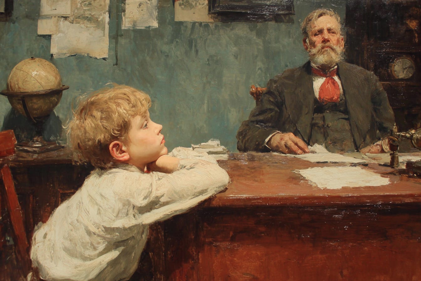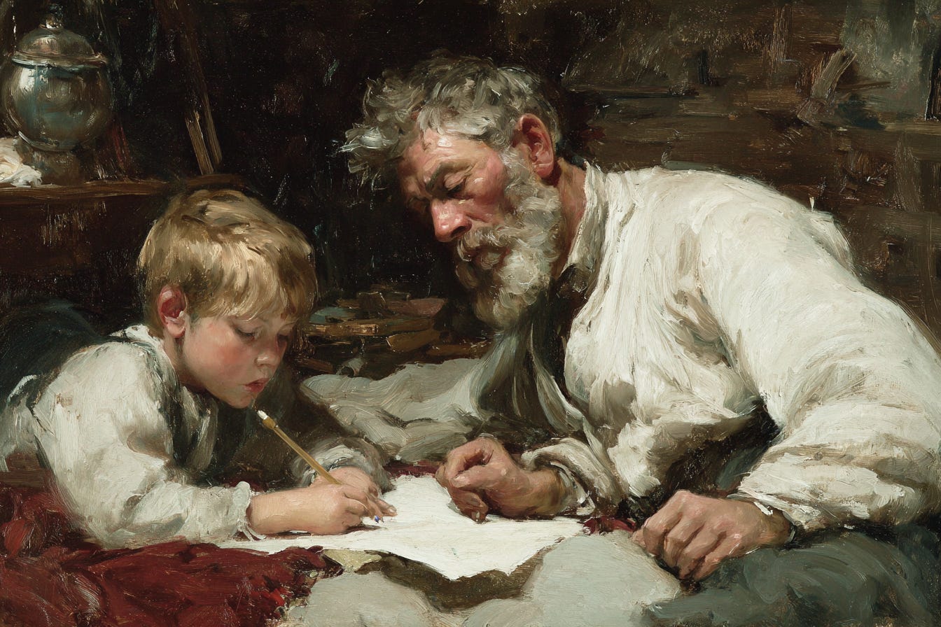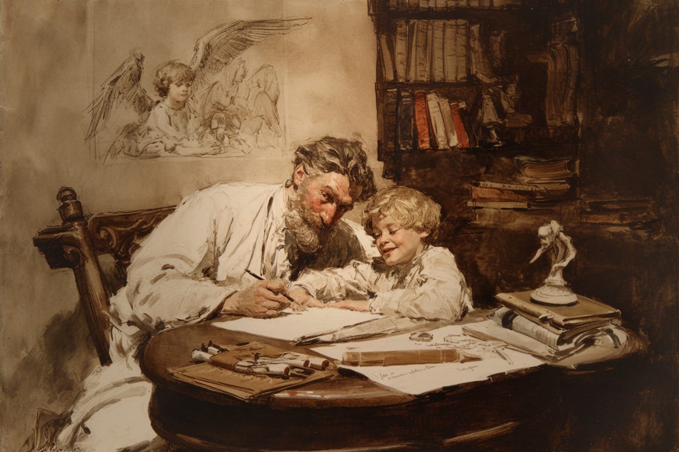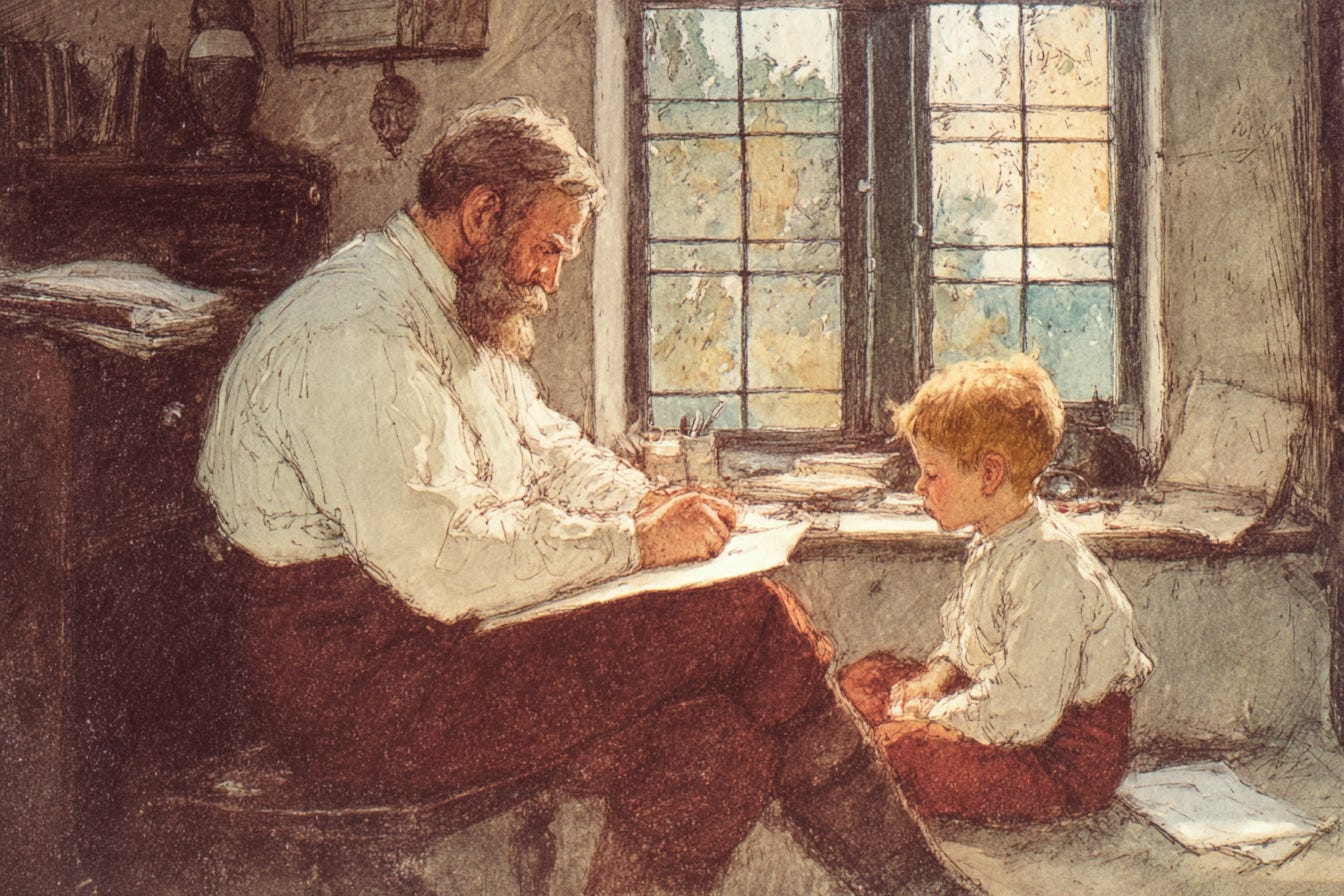 Imitation is more than the best flattery. It is also how the young learn from their elders. They may not yet see how best to form the motions, much less the words, but the imprint of the work begins to leave it’s mark, and the skills will come with time and tender caring. A father’s patience, in recognizing that these interruptions and distractions will be, in time, his greatest legacy, is a fine thing to see in a parent.