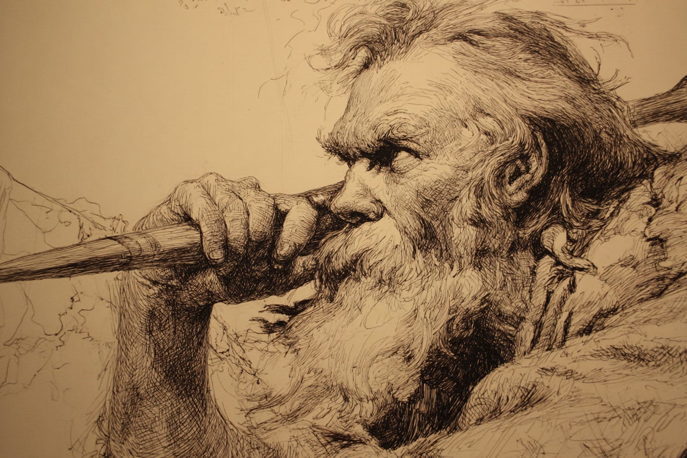 And sketched on horn the spear he hurled,