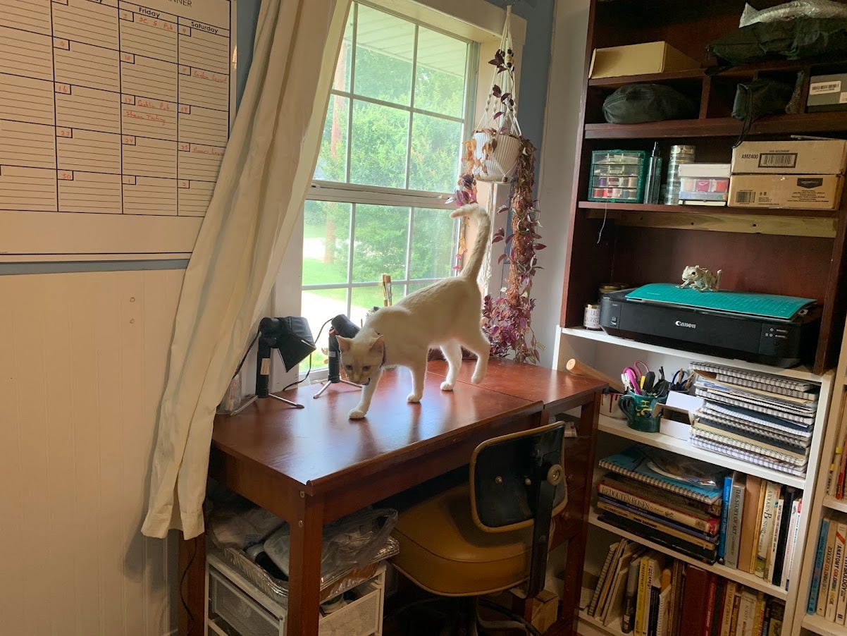 Another goal is to sort through all of my supplies, figure out what I actually want to use, what I should pass on to someone else, and what just flat needs to be tossed. I have years of accumulations, some of it moved more than once, and never used. I had to toss a bottle of ink that had started to dry and go chunky. I suspect there are other things (paints… alcohol markers!) which will have gone bad through neglect and disuse.