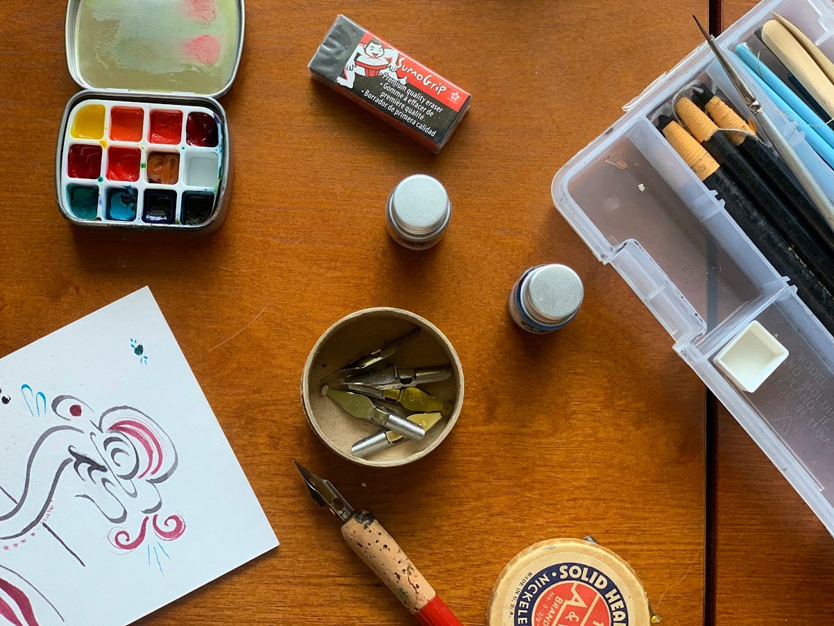 Once I persuaded Toast that her cat shelves were more comfortable than my art desk, I sat there for a long time staring at a postcard. I didn’t have a lot of time, but I really wanted to actually make art, on paper, and I had no ideas. Finally, I swung around and looked at the shelves. I had inks. I had dip pens - well, I have several, but I found one. I had paintbrushes, and alcohol for cleaning, and a moment later, a cup of water for rinsing as well. I stopped trying to ‘make art’ and just made marks. One of my goals is going to be to make physical art every day, again. I miss that.