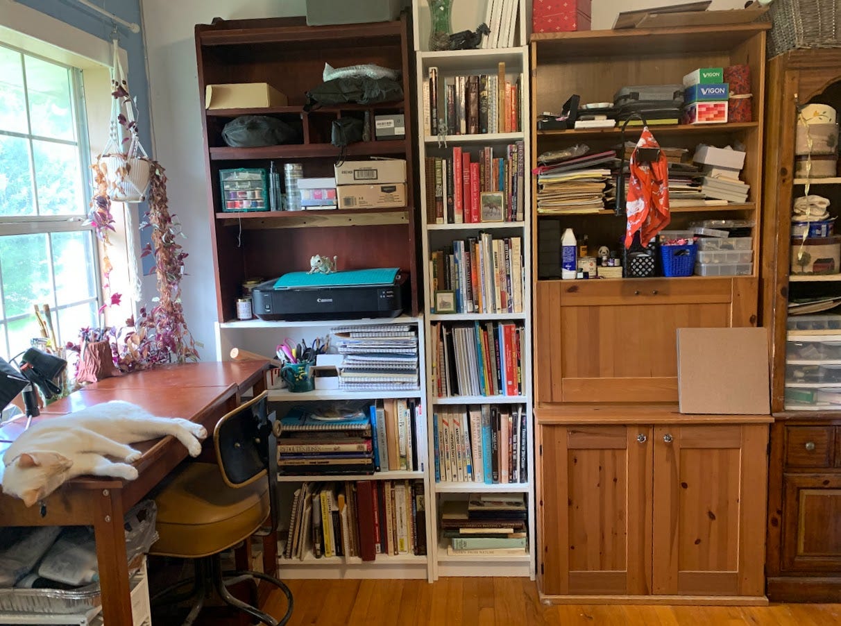 This post, as you can see from the title, isn’t about food. As life is settling down, coming out of the storm, so I have some peace, I’m feeling the creative urges rising. I spent some time working indoors, as it was ugly hot and humid outside in the evening, and part of the work was in my art room. I moved a bookcase out, into the dining room as my cookbooks have badly overflowed their space. I have enough storage, in theory, for the art supplies. Would have loads of space, except… see below.