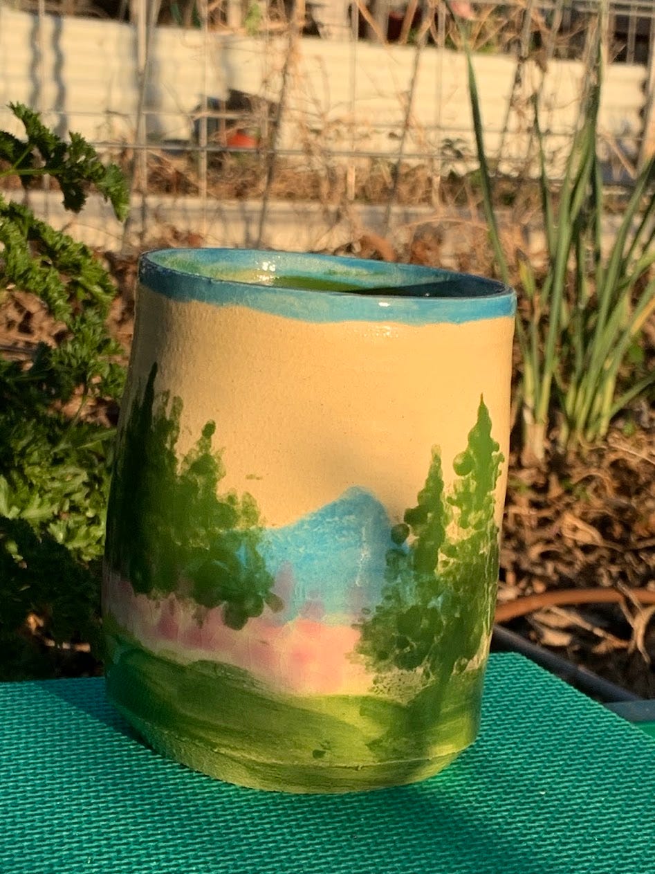 Glazing them was more of an adventure. I learned on high-fired stoneware, which has different properties than the low-fire earthenware clay body, and very different glaze behaviour. With all the colors available I wanted to try to see if watercolor principles would work in painting scenes and details on the pots, and the answer is yes, to a point. I would have to do a lot more work to really get a feel for the glazing.
