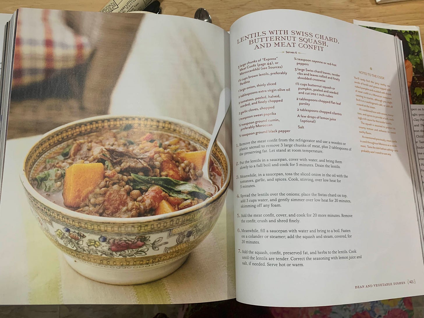 To start off, I was looking for a recipe to use about 13 pounds of frozen chicken legs and quarters. Also, as I’d been starting the deep-clean of the pantry and unearthed lentils, I wanted to use those up. A hearty lentil stew seemed to be indicated. On a whim, I pulled a stack of cookbooks down and settled in to do some research. I had a specific flavor profile in mind that should work well with those two proteins, so I visited the southern and eastern coastlines of the Mediterranean. I found some recipes that were promising, but one in Paula Wolfert’s beautiful Food of Morocco1 really spoke to me, and looking at the lentil dishes gave me ideas there as well.